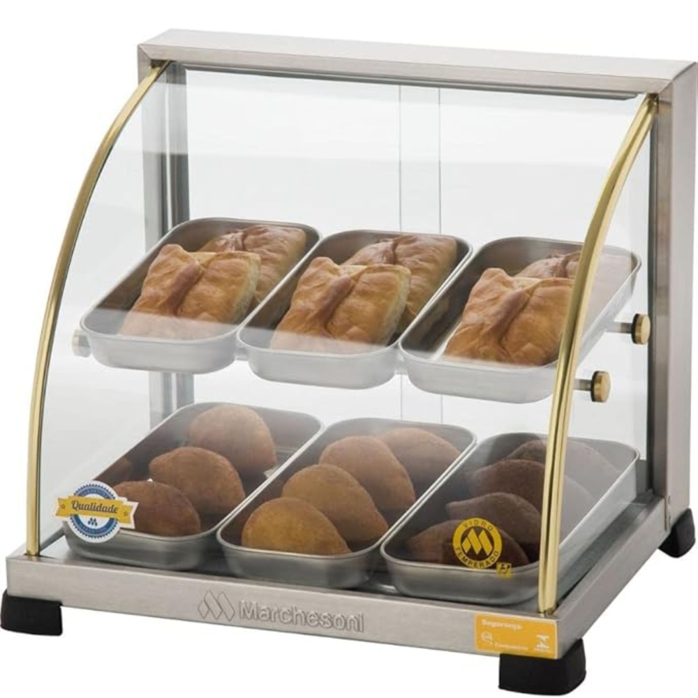 | As Estufas da linha Ouro Marchesoni são ideais para expor com elegância e manter os alimentos sempre quentinhos. Suas bandejas são em aço inoxidável com 3cm de altura. Elegantes frisos dourados, com termostato bimetálico para economia de energia elétrica, resistência tubular de baixo consumo, seus vidros são temperados para maior segurança e umidificadores para manter o salgado sempre fresquinho. |