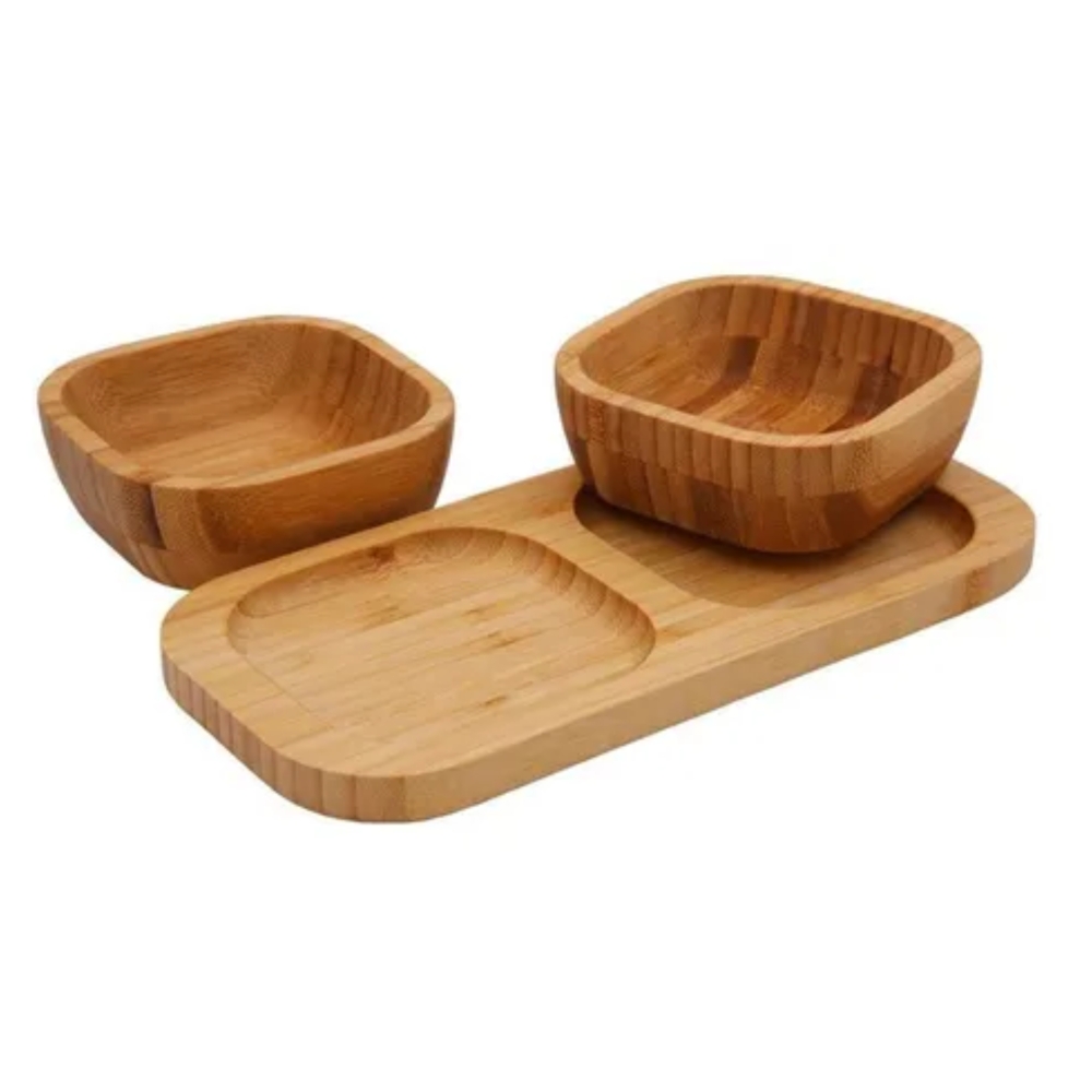 | Eleve sua experiência ao servir com este conjunto de 2 petisqueiras de bambu, composto por 3 peças: dois mini bowls e um prato de apoio. Fabricado em bambu natural, este conjunto é sustentável, funcional e perfeito para servir petiscos, molhos, queijos, ou sobremesas com elegância. |