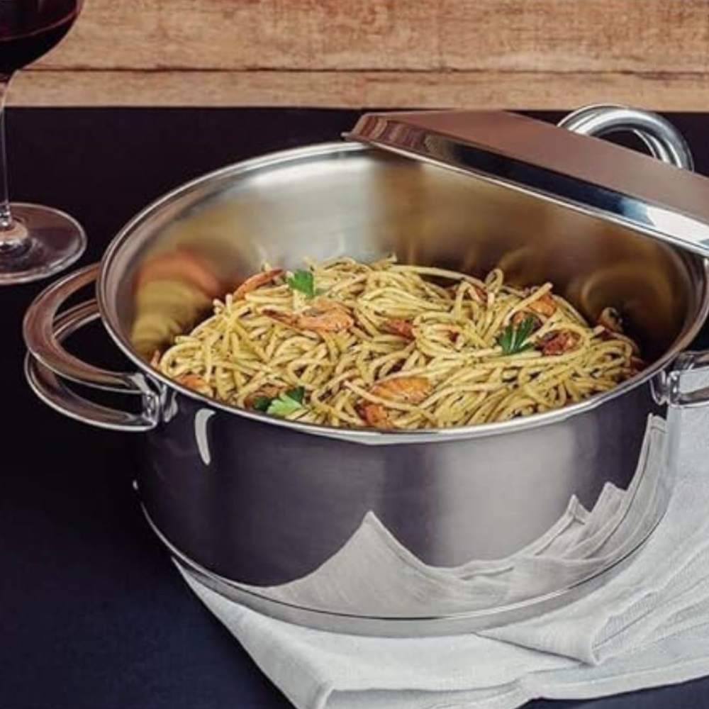 Eleve suas receitas a um novo nível! Com a Caçarola Solar Tramontina, você cozinha de forma mais uniforme e rápida, graças ao fundo triplo de alta performance.