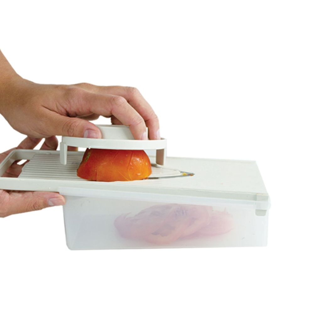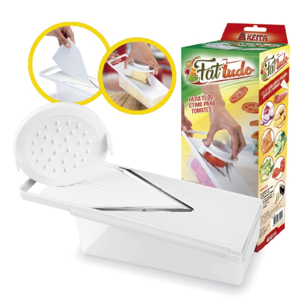 | O Fatiador de Tomate Keita é ideal para fatiar qualquer tipo de legumes, frutas e alimentos, possui uma lâmina super afiada, acompanha um protetor de mãos e além disso vem com uma base aonde as fatias cortadas ficam armazenadas. O produto também possui dois graus de cortes, um mais grosso e o outro mais fino |