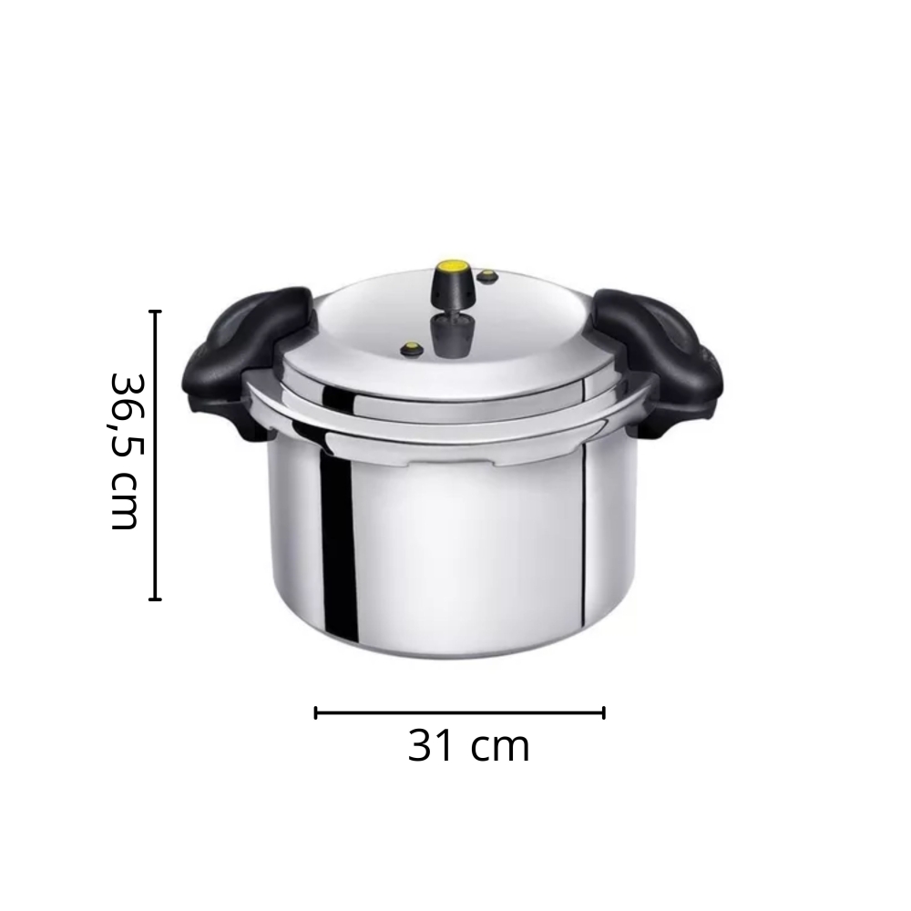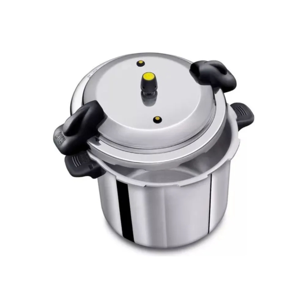 | Panela de pressão em alumínio polido com fechamento externo e cabo de baquelite, possui válvula de segurança, pino de saída de vapor, anel de vedação e travas de segurança. Utensílio culinário para um cozimento rápido e seguro de diversos alimentos. |