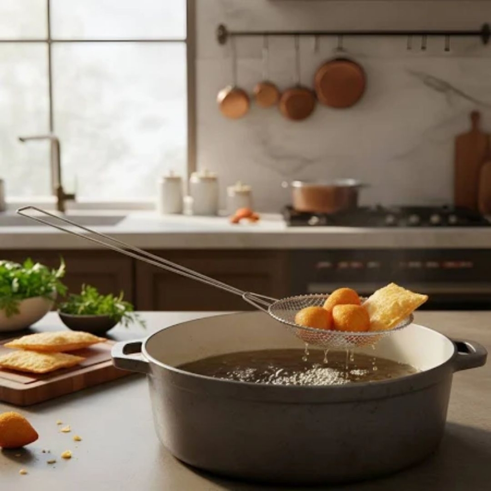| Escumadeira para fritura redonda de 20CM feita de aço estanhado malha fina. São fabricadas inteiramente em aço estanhado e próprias para manuseio de pastéis e outras frituras levadas ao tacho. |
