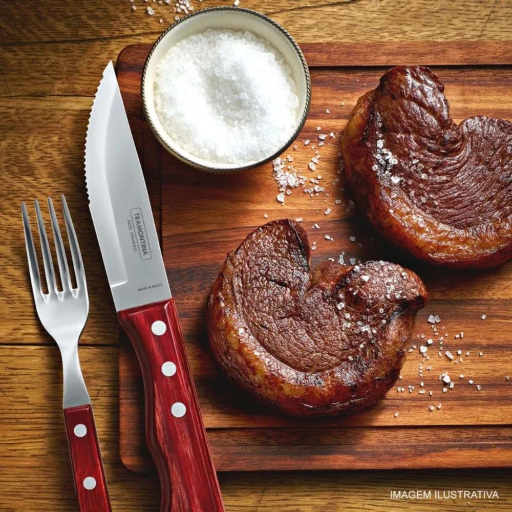 | Desenvolvida com fio serrilhado, a Faca para Churrasco Jumbo Tramontina Churrasco com lâmina em aço inox e cabo em madeira tratada Polywood 5 polegadas é ideal para o corte de carnes cozidas e tem lâmina de aço inox com tratamento térmico que garante maior resistência em seu fio de corte. |