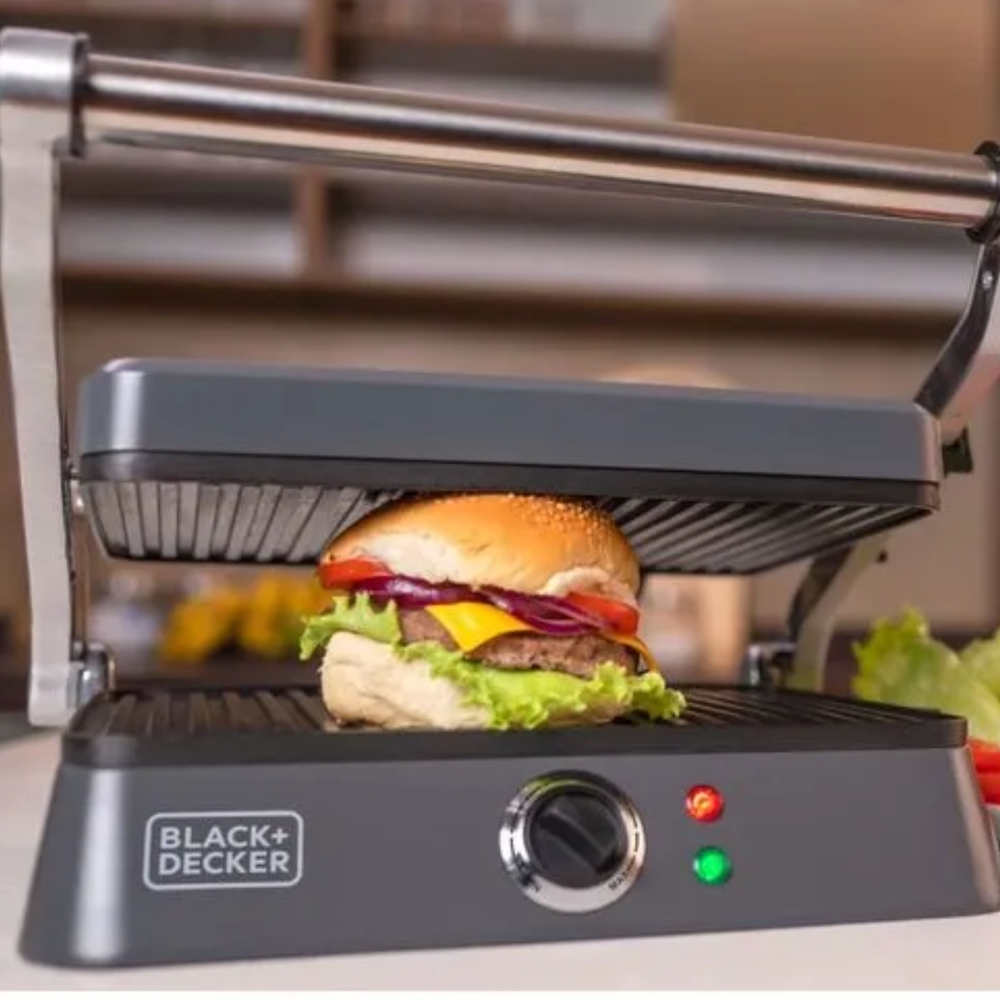 | O Grill Elétrico B&D com Abertura de 180º facilita o preparo de carnes, legumes e sanduíches crocantes com suas chapas antiaderentes. Sua chapa superior ajustável se adapta a diferentes tamanhos e espessuras de alimentos. Além disso, reduz a gordura nos alimentos, tornando-os mais saudáveis. |